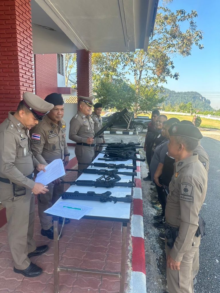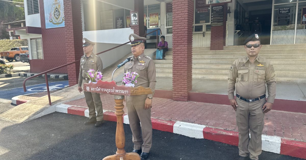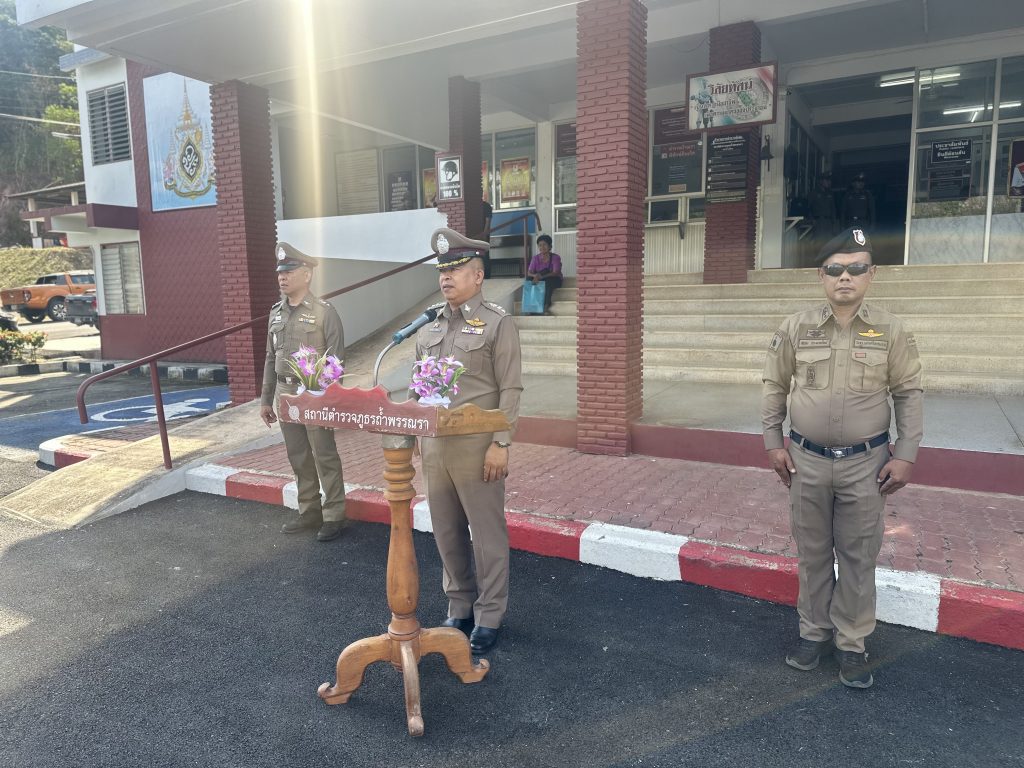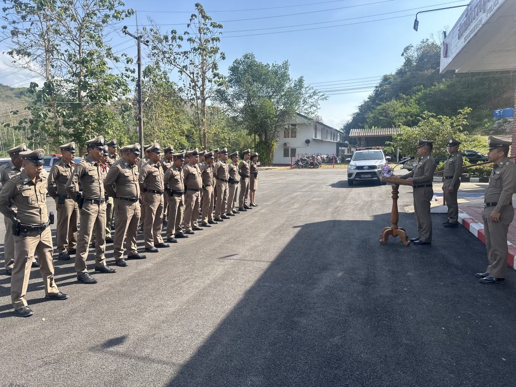 พ.ต.อ.ชัยภัทร ศรีเรือง ผกก.สภ.ถ้ำพรรณราและคณะกรรมการการตรวจทรัพย์สินของทางราชการ พร้อมข้าราชการตำรวจ สภ.ถ้ำพรรณรา ร่วมกันเข้าแถวเคารพธงชาติ และตรวจอาวุธปืนประจำเดือน กุมภาพันธ์ 2568