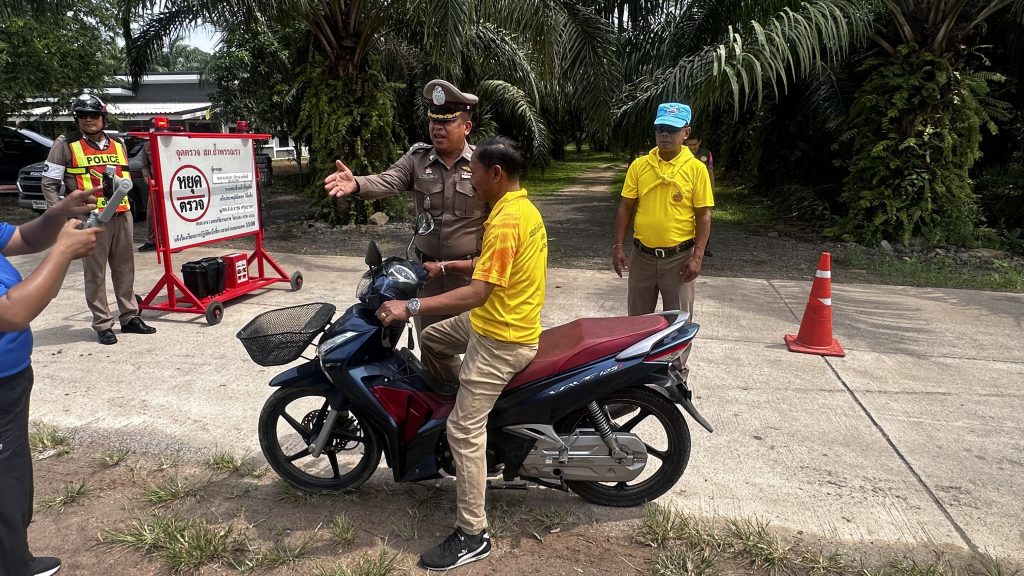 พ.ต.อ.ชัยภัทร ศรีเรือง ผกก.สภ.ถ้ำพรรณรา พ.ต.ท.ณัฐวิทย์ โอทอง รอง ผกก.ป.สภ.ถ้ำพรรณรา และ พ.ต.ท.สนอง ประมวลศิลป์ สวป.สภ.ถ้ำพรรณรา ร่วมตั้งด่าน และแจกหมวกกันน็อคโครงการจิตอาสาจราจร รณรงค์การขับขี่ปลอดภัยสวมหมวกนิรภัย เพื่อลดอุบัติเหตุในช่วงเทศกาลสงกรานต์ 2568