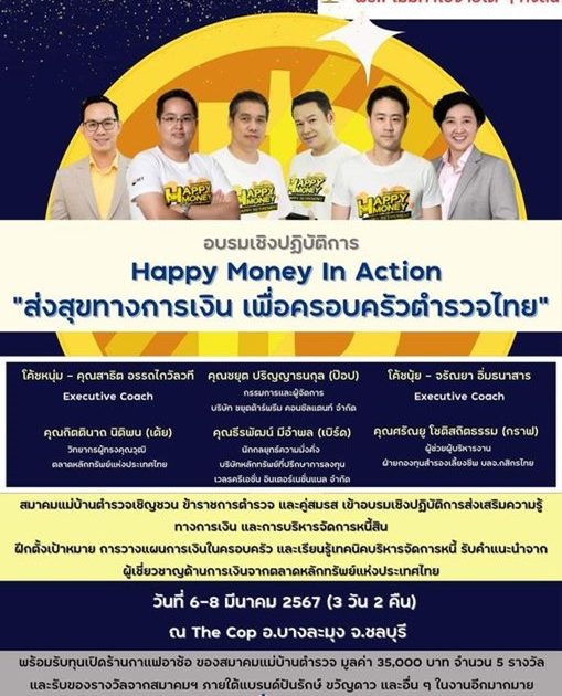 “ส่งสุขทางการเงินเพื่อครอบครัวตำรวจไทย“ ด้านการบริหารการเงิน และการจัดการหนี้สินในครอบครัว”วันที่ 6- 8 มีนาคม 2567 (ค่ายอบรมวัน 2คืน) ณ The Cop Seminar & Resort อ.บางละมุงจ.ชลบุรี คุณจะได้เรียนรู้