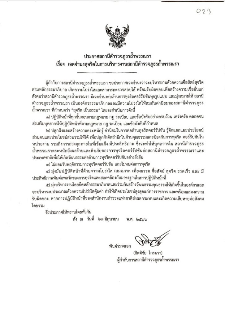 เจตจำนงสุจริตในการบริหารงานสถานีตำรวจภูธรถ้ำพรรณรา