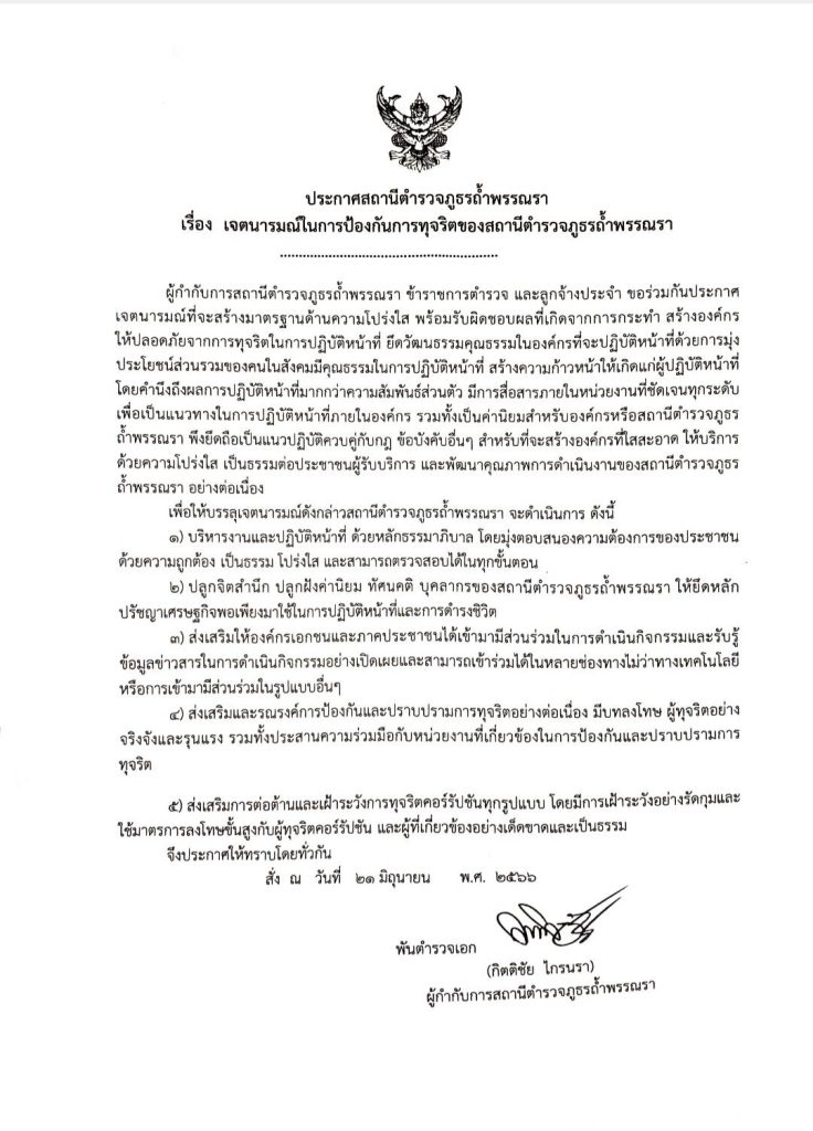 เจตนารมณ์ในการป้องกันการทุจริตของสถานีตำรวจภูธรถ้ำพรรณรา