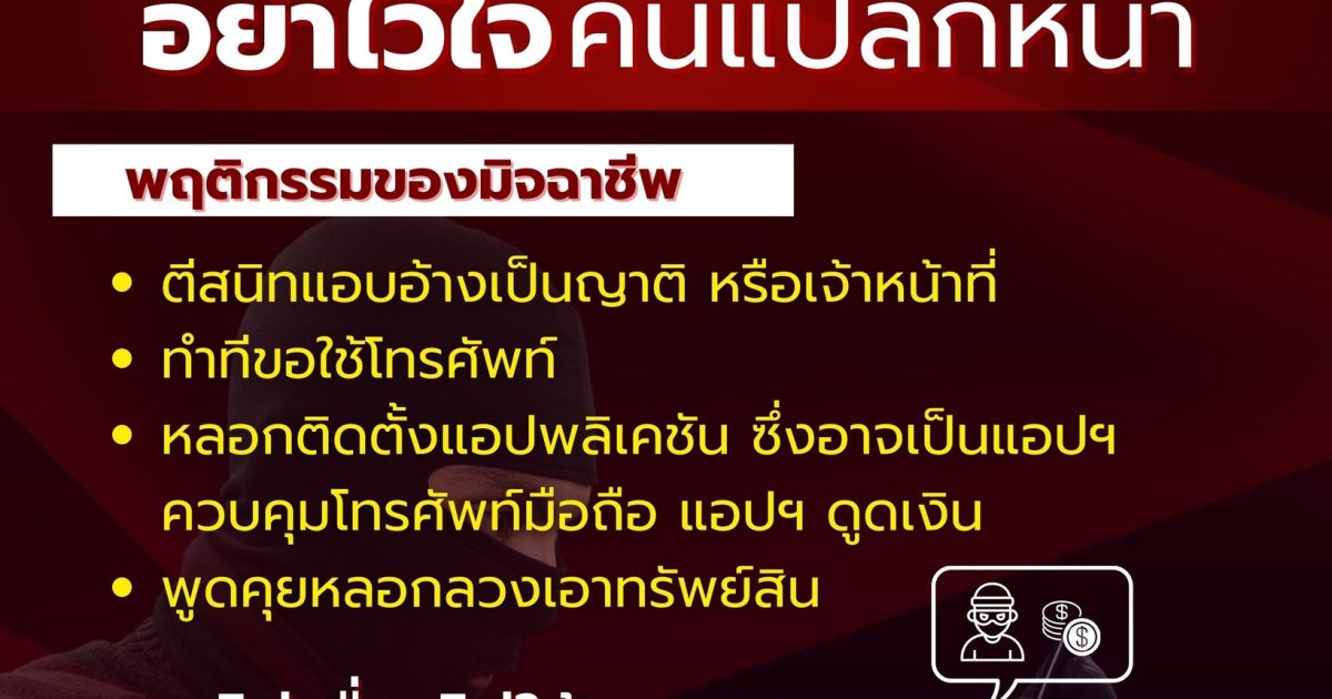 เตือนภัยผู้สูงวัย ท่องไว้ “ไม่เชื่อ ไม่ให้ ไม่ไว้ใจ ไม่โดนหลอก” สำนักงานตำรวจแห่งชาติห่วงใย เตือนไว้โปรดระวังภัยจาก “คนแปลกหน้า” 4 เมษายน 2567 โดย admin / ข่าวประชาสัมพันธ์ เตือนภัยผู้สูงวัยเมื่อท่านไปในที่สาธารณะ เช่น โรงพยาบาล หน่วยงานราชการต่าง ๆ ที่มีผู้คนไปใช้บริการจำนวนมาก แม้เป็นสถานที่ปลอดภัย แต่ก็อาจมีมิจฉาชีพแฝงตัวมาสำนักงานตำรวจแห่งชาติห่วงใย เตือนไว้โปรดระวังภัยจาก "คนแปลกหน้า"พฤติกรรมของมิจฉาชีพ- .. ตีสนิทแอบอ้างเป็นญาติ หรือแอบอ้างเป็นเจ้าหน้าที่- .. ทำทีขอยืมใช้โทรศัพท์- .. แอบติดตั้งแอปพลิเคชันควบคุมโทรศัพท์มือถือ หรือแอปฯดูดเงิน- .. พูดคุยหลอกล่อ ลวงเอาทรัพย์สินท่องไว้ "ไม่เชื่อ ไม่ให้ ไม่ไว้ใจ ไม่โดนหลอก"ท่านสามารถแจ้งเหตุ ขอความช่วยเหลือได้ที่โทร.สายด่วน 191 Facebook iconFacebookTwitter iconTwitterLINE iconLine